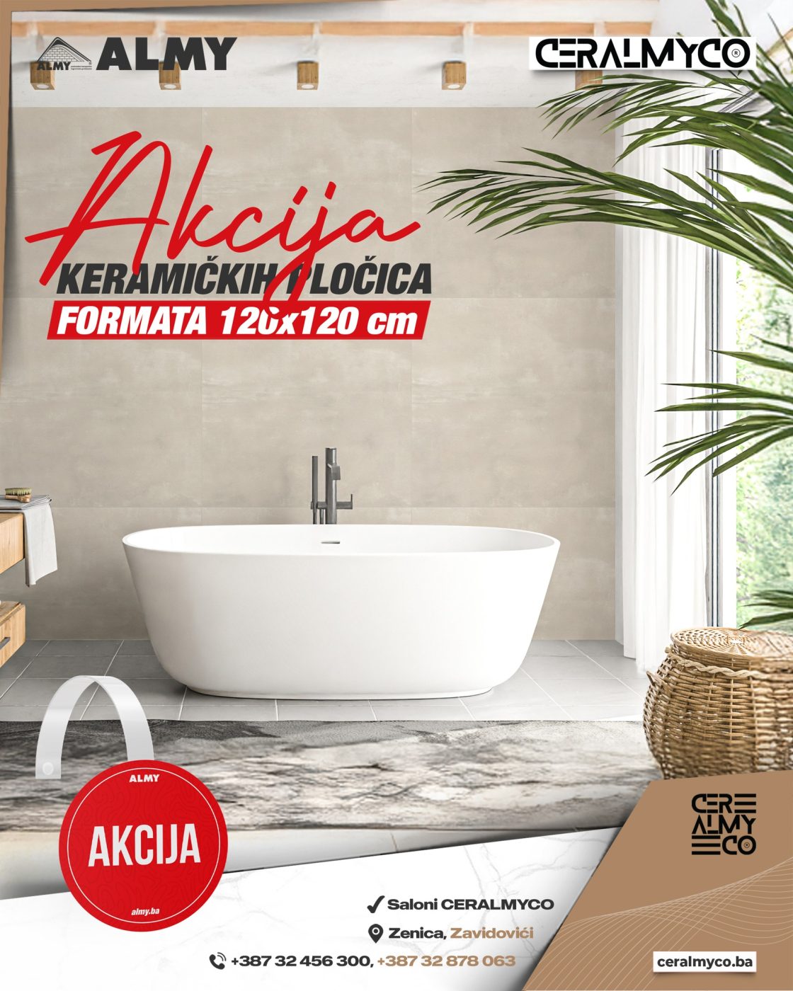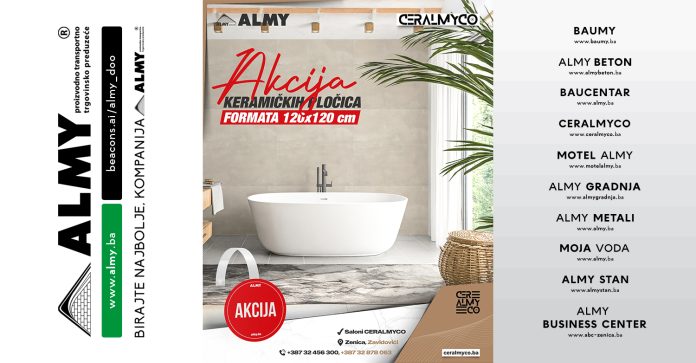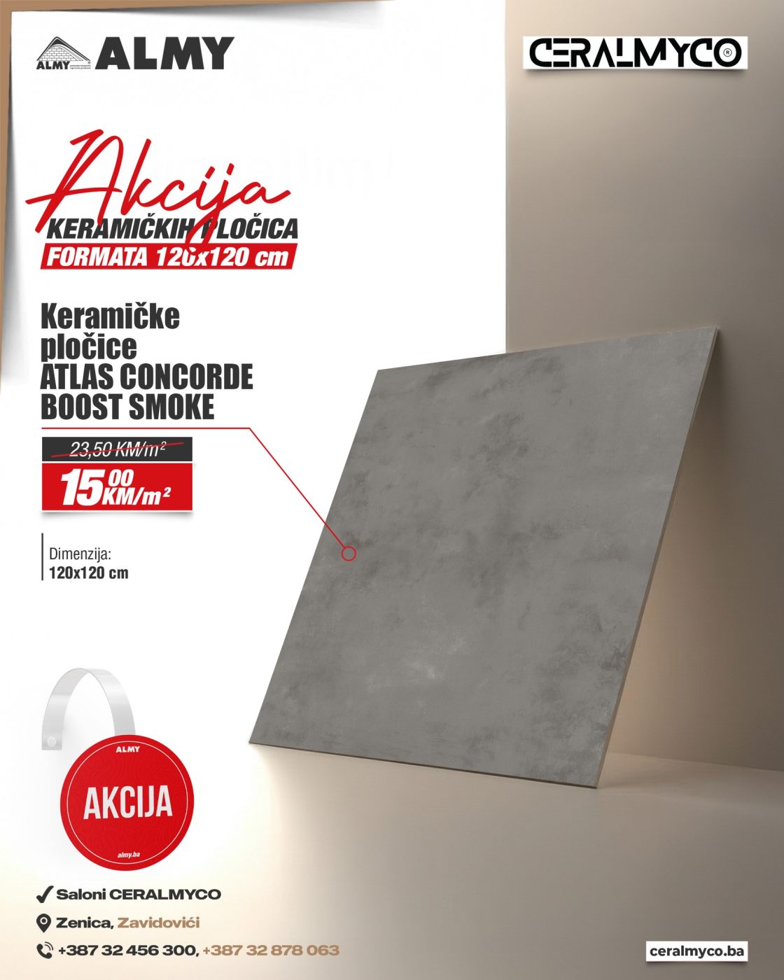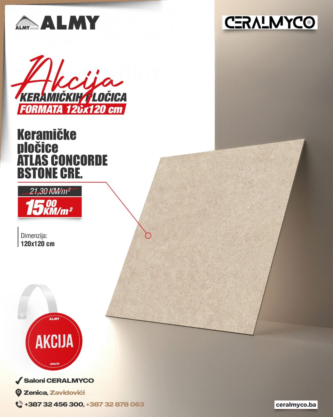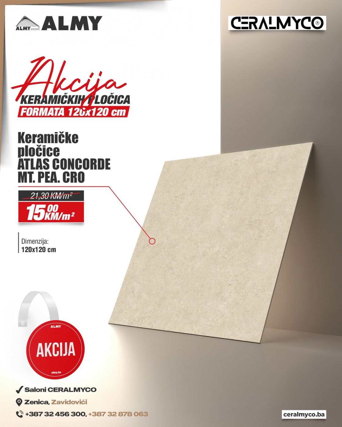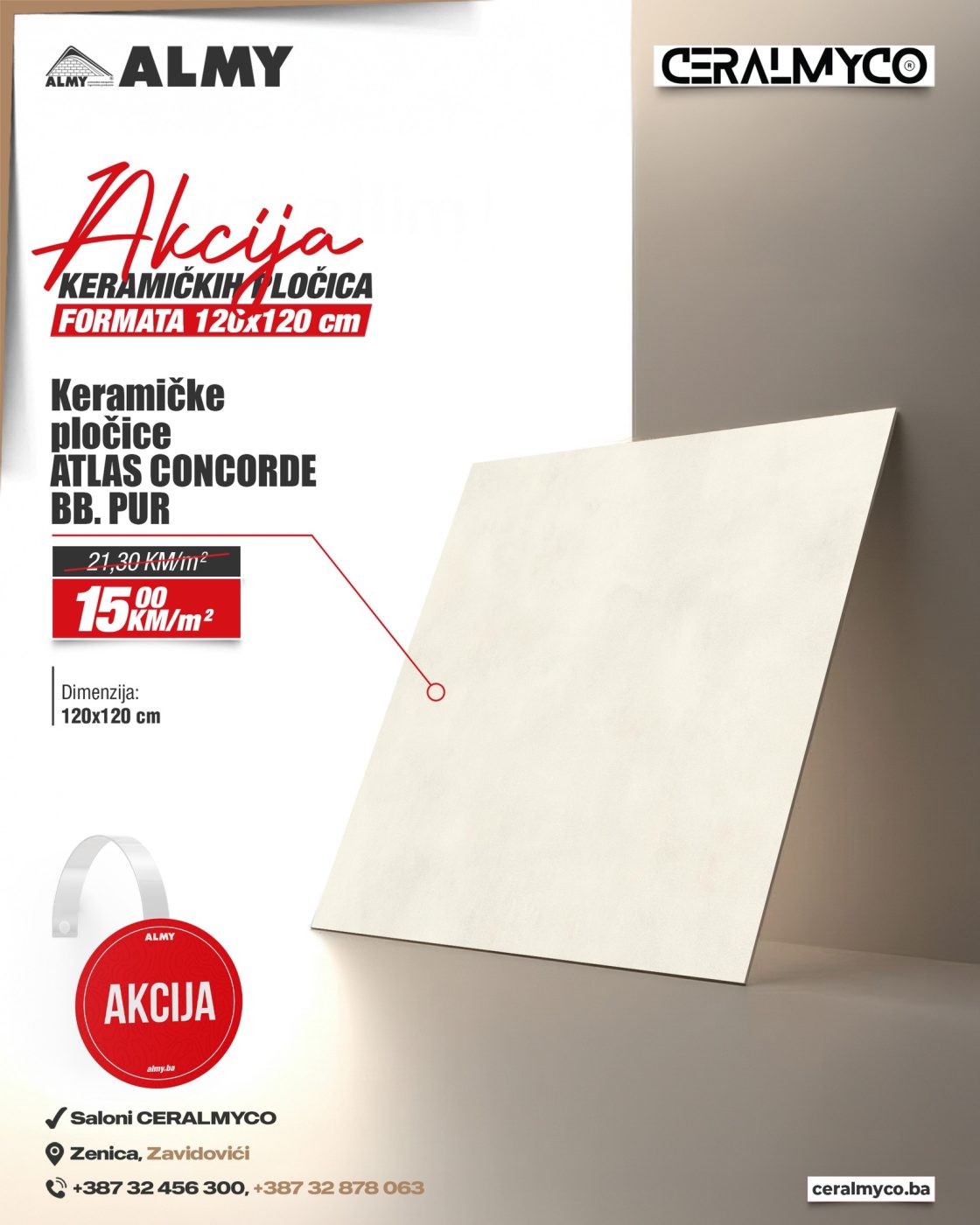 Saloni CERALMYCO u Zenici i Zavidovićima pripremili su posebnu akcijsku ponudu keramičkih pločica kvadratnog formata 120 x 120 cm, koje kombinuju vrhunski kvalitet i moderan dizajn po izuzetno povoljnim cijenama.