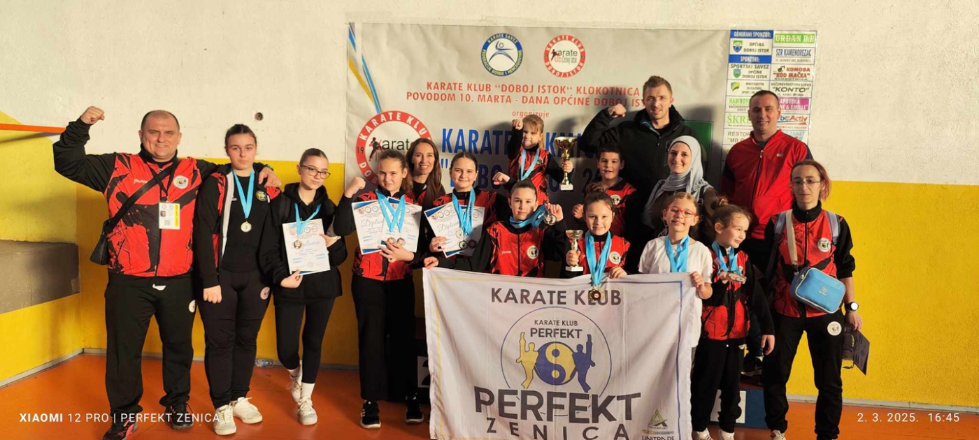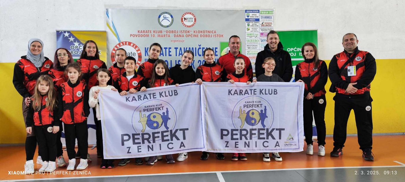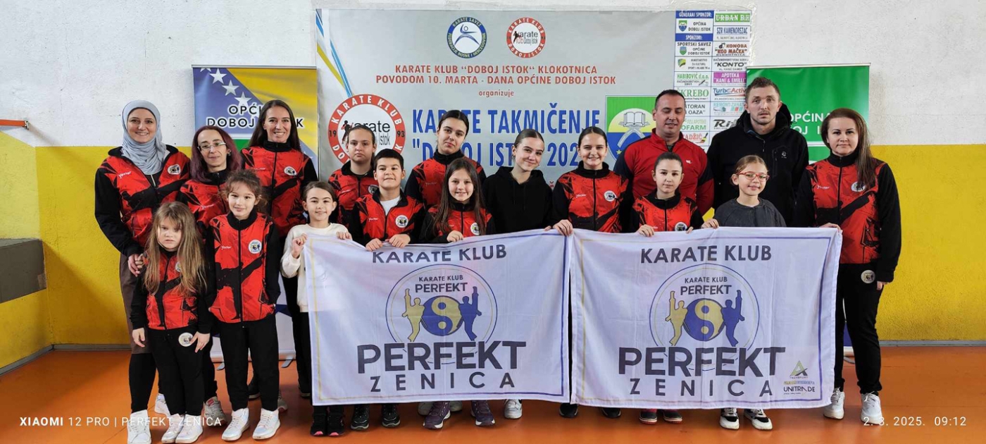 U nedjelju, 2. marta, Karate klub Perfekt Zenica učestvovao je na karate turniru Doboj Istok 2025, koji je okupio 39 klubova sa ukupno 405 učesnika i 493 prijave. Klub se istakao kao najbrojniji, sa 35 prijava, te je za tu čast primio najveći zlatni pehar. Takmičari Perfekt Zenice osvojili su ukupno 25 medalja: 3 zlatne, 6 srebrenih, 13 bronzanih i 3 učesničke medalje.